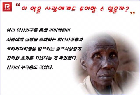 이버멕틴은 중남미나 아프리카 나이지리아와 에티오피아에서 감염자가 많이 발생하고 있는 회선사상충증(onchocerciasis)의 특효약입니다. 회선사상충증은 온코세르카증이나 river blindness 라고도 부르고, 심한 가려움증, 외관을 손상시키는 피부의 변화, 영구 실명을 포함한 시각장애를 일으킵니다. 기타 많은 종류의 기생충 질환에 유효하고, 인간뿐만 아니라, 동물의 기생충 질환 치료제로 널리 사용되고 있습니다.