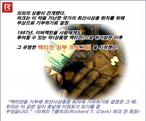 물론 도구가 있다는 사실만으로 질병이 사라지지 않는다. 이를 어떻게 생산하여 전달하고, 그에 따른 행정 절차와 자금을 어떻게 해결하는지에 대한 대단히 현실적인 장벽들이 남아 있다. 여기서 다시 한 번 놀라운 일이 일어난다. 이버멕틴의 특허권을 가지고 있던 머크에서 이버멕틴을 강변사상충 퇴치 프로그램에 무상으로 무한정 기부하기로 약속한 것이다. 이런 협력은 전례가 없었을 뿐 아니라, 최대, 최장의 사례로 남게 되었다.