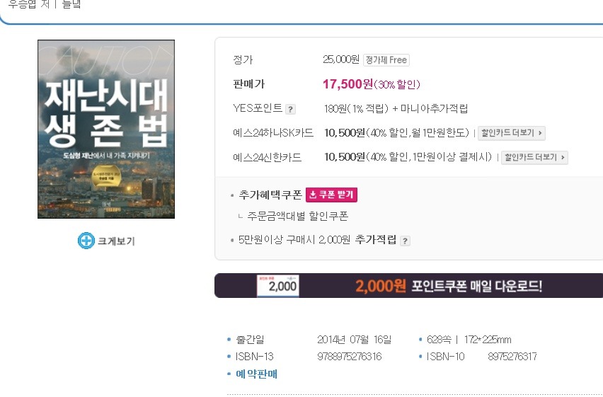 일반서점과 yes24와 알라딘등 온라인서점에서 [재난시대 생존법 - 도심형 재난에서 내가족 지켜내기] 판매를 시작했습니다