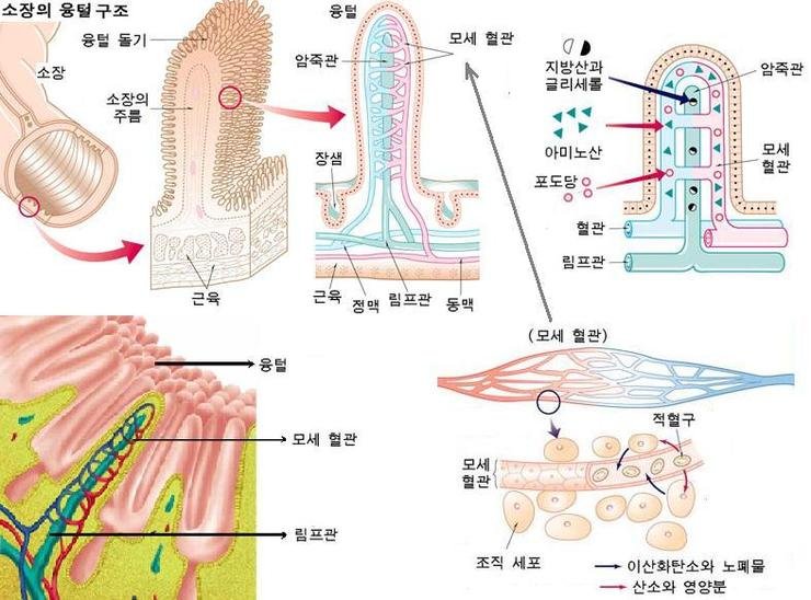 각각의 융털에는 모세혈관과 림프관이 존재하게 되는데