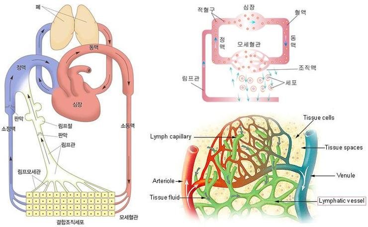 따라서 모세혈관의 동맥측에서는 혈압이 높아서 혈장성분은 혈관 밖으로 여과되어 조직액이 되는데,