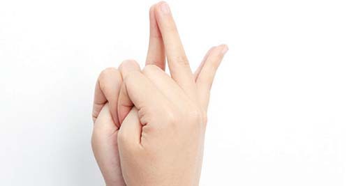 왼 손바닥 위에 오른손을 올린 뒤 양쪽 엄지를 교차시킨후 아랫배에 손바닥을 대고