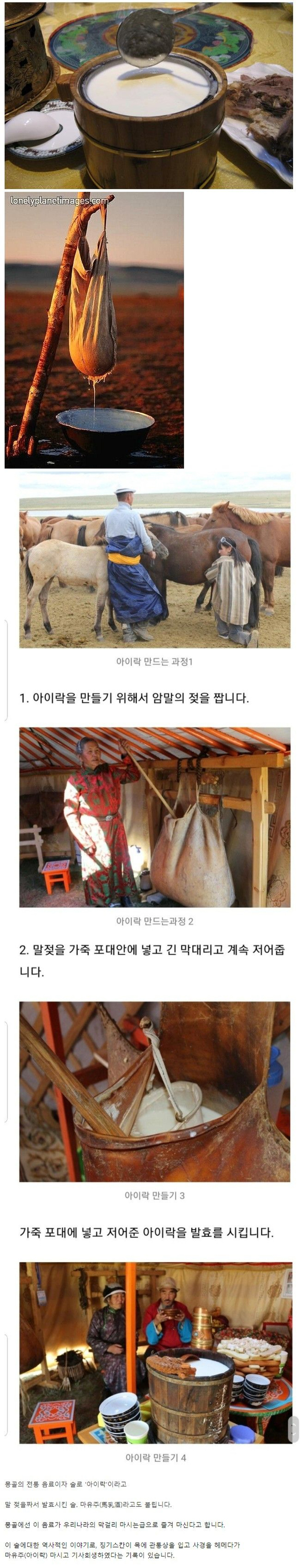 작성자노마드( 몽골) 작성시간 21.09.20 마유주는 말 그대로 말의 젓을 이용하여 만드는 발효주인데 막걸리와 비슷합니다.