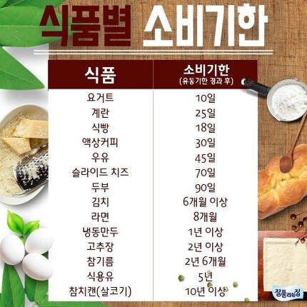 유통기한 식품별 소비기한입니다.