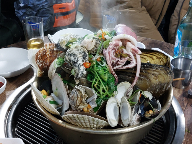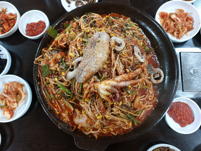 키조개와 석화, 가리비, 바지락, 대합, 홍합에다 오징어까지 넣은 찜 요리. 해물찜은 시각적으로 푸짐해 보여 식욕을 자극한다.