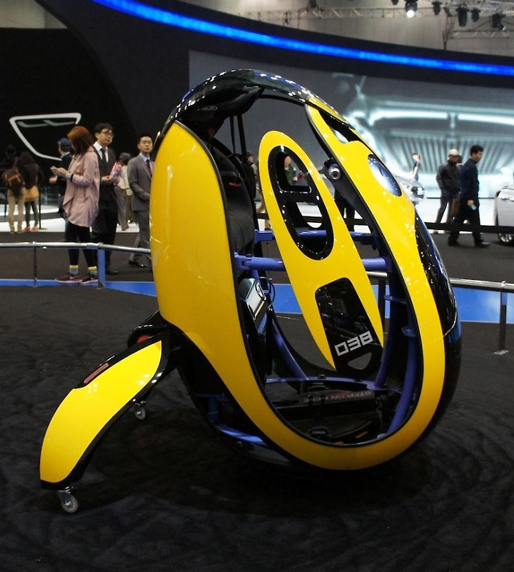 드디어 우리나라 오토바이! 우리나라 오토바이는 영상까지 넣어봤습니다 현대 자동차가 서울모터쇼에서 선보인 독특한 외모의 E4U 컨셉카입니다 계란을 연상시키는 외모로 달걀(egg)의 E에서 이름을 따왔다고 합니다. 또한 Evolution(진화), Electricity(전기), Eco-friendliness(자연친화적)의 의미도 담아 4개의 E가 있어 이름이 E4U가 되었다고 하네요 루프가 특이하게 생겼는데 이것은 운전자가 머리에 쓸 수 있게 되어 있고 이것은 일종의 헬멧이자 스크린 역할을 합니다. 두 개의 접이식 다리가 있으며 바퀴가 장착되어 있어 정차시 사용됩니다. 운행 방법은 운전자가 몸을 앞 뒤 좌 우로 기울여 방향과 움직임을 조절합니다 무게는 80kg이며 24V 배터리로 500W의 전기 모터를 구동하며 최고 속도는 시속 30km. 양산되어 판매되면 정말 재밌는 모습을 볼 수 있을 것 같습니다.