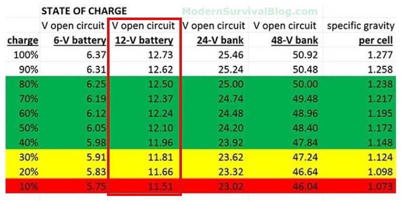 자동차 배터리의 전압으로 보는 남은 용량 표 입니다.