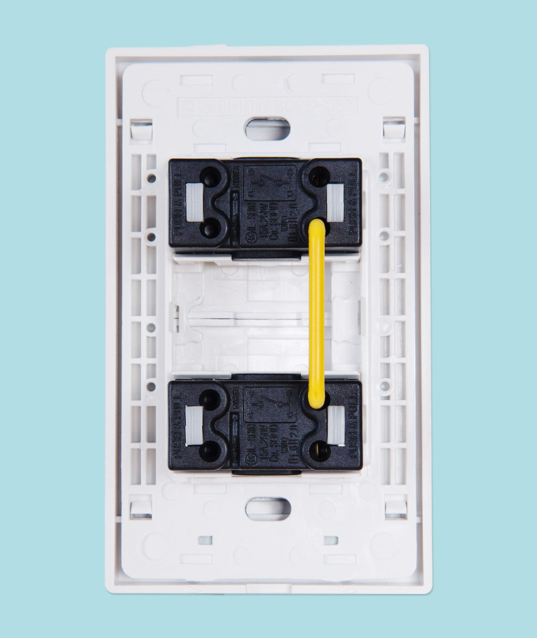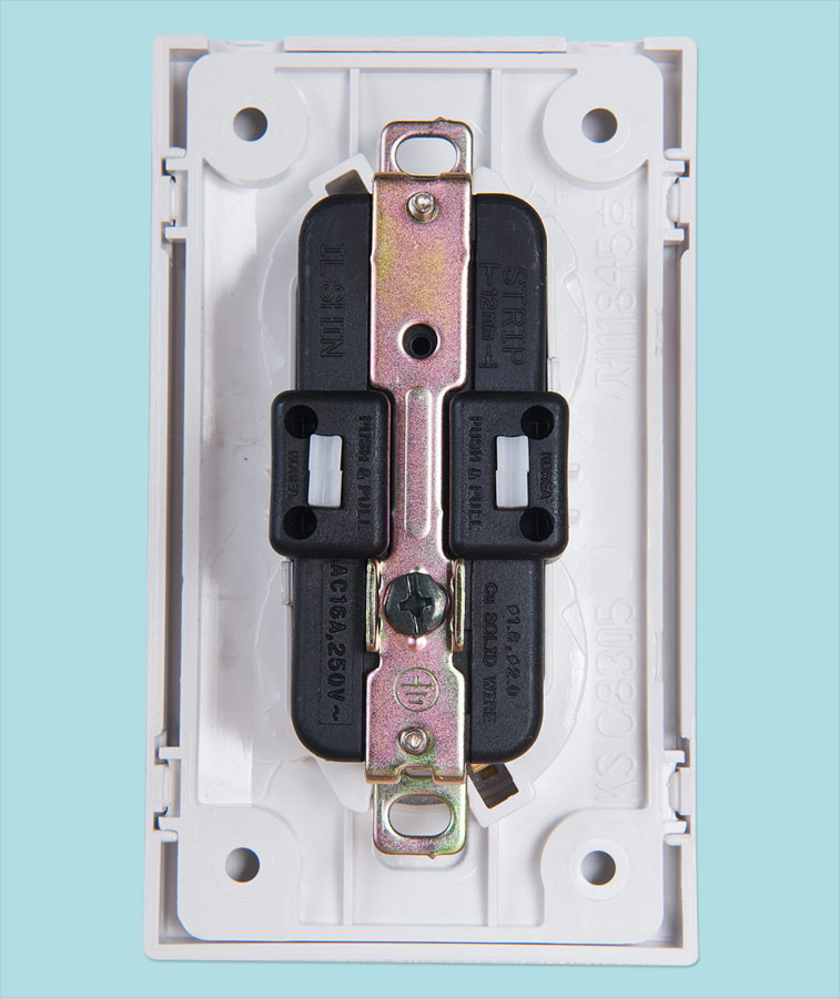 교체할 새로운 전기 스위치 본체에 전선을 끼우는 과정으로 점프선은 이미 붙어있다. 미리 표시해 둔 이름표에 적은 위치대로 제 위치에 구리선을 끼운다. 별도의 누름 장치들 없이 한번에 깊숙하게 넣으면 알아서 전선이 물린다. 반드시 피복 부위까지 최대한 가깝게 끼워 구리선이 밖에서 보이지 않게 한다. 연결이 끝났으면 이름표 등을 제거한다.