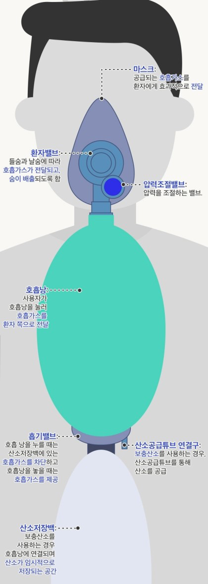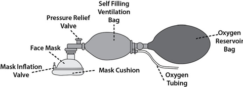 만약 어떠한 이유로 들이쉬고 내쉬는 자가 호흡이 어려운 경우 아래와 같은 암부백(ambu, Self filling ventilation baf)에 산소 호스를 연결하고 손으로 짜주면 폐에 공기+고농도산소를 불어 넣을 수 있더군요.