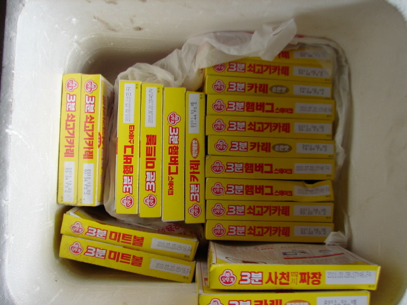 사진에는 2박스지만 안보이는데 두박스가 더 있고 총 100개정도의 3분짜장, 3분카레나 햄버거, 미트볼등이 있습니다