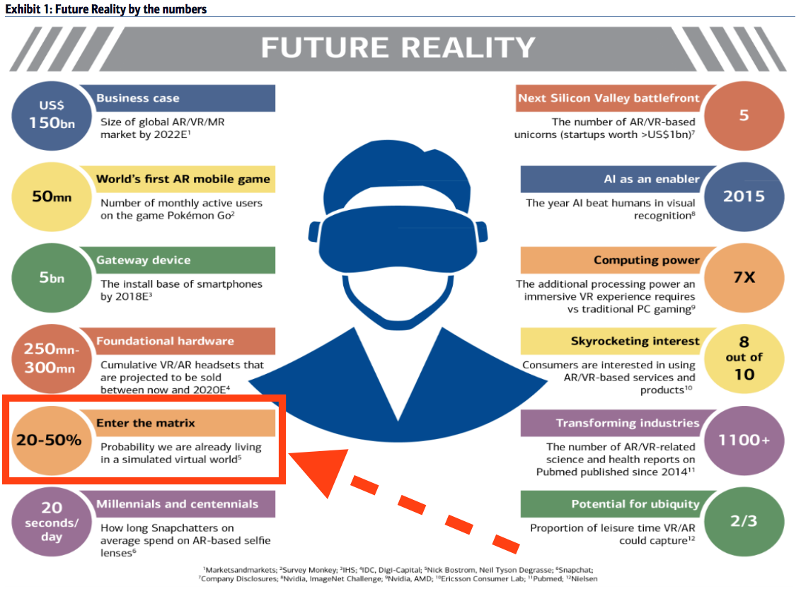 메릴린치는 스웨덴의 철학자 닉 보스트롬의 2003년 논문과 테슬러 모터스의 최고경영자(CEO) 일론 머스크, 천문학자 닐 더그래스 타이슨의 발언 등을 근거로 “우리가 매트릭스에서 살고 있을 확률이 20~50%에 이른다”고 분석했다.