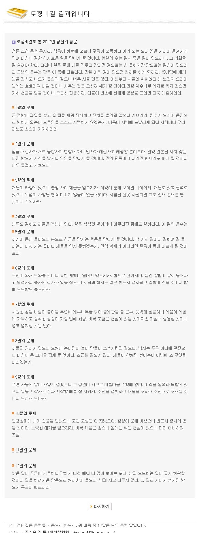 2012년 내년의 토정비결 한번 보세요 무료사이트입니다