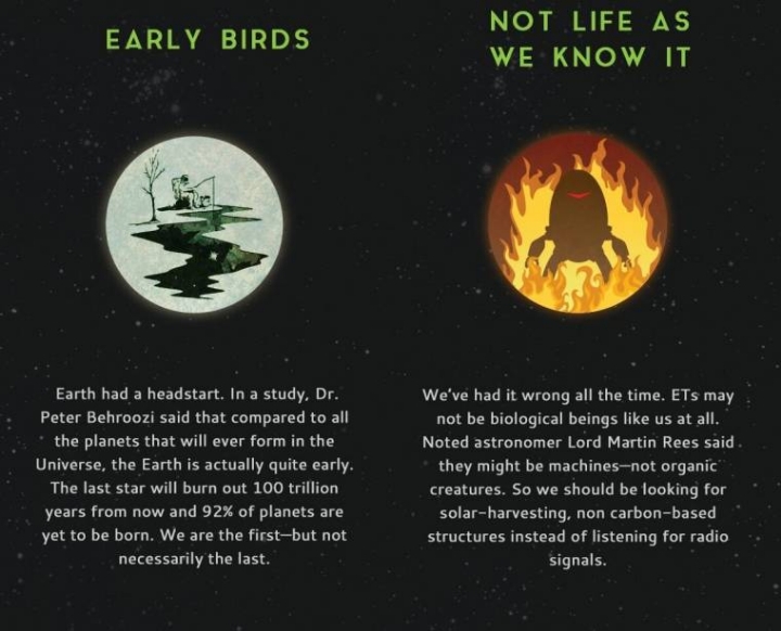 우리는 지금까지 완전히 잘못 생각했다. 외계인들은 어쩌면 우리와 같은 생물학적인 존재들이 전혀 아닐지도 모른다. 저명한 천체학자 Lord Martin Rees에 따르면 아마 그들은 기계일수도 있다 - 유기체가 아니라. 그러므로 우리는 라디오 신호를 듣는것 대신 태양에너지 수확량, 비탄소 구조물을 찾아야한다.