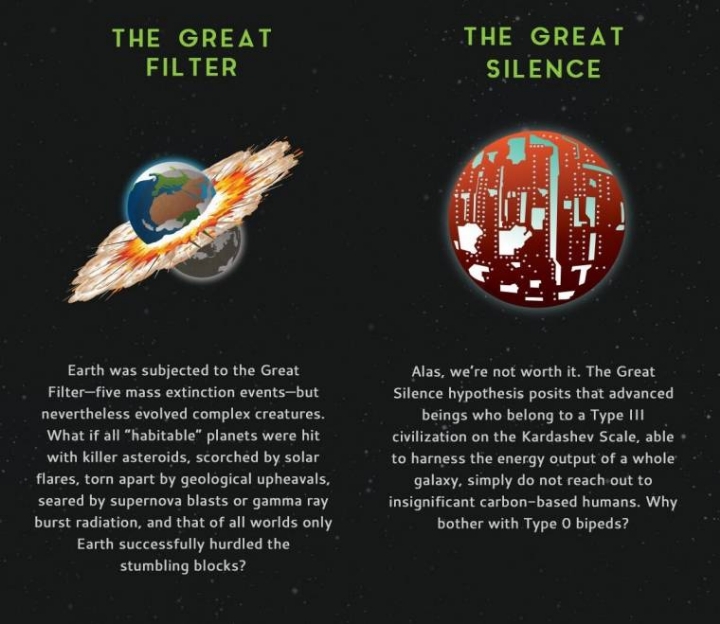 지구는 거대한 필터(대재앙)를 겪었다. - 5번의 대량 멸종 사태 - 그럼에도 불구하고 복잡한 생명체로 진화하였다. 만약 모든 "거주가능한" 행성들이 킬러 소행성과 충돌하고, 태양풍에 의해 타버리거나, 지질학적인 대변동으로 찢어지고, 초신성 폭발이나 감마 레이 폭발에 의해 타버린다면? 그리고 그 모든 세계(행성들)들 중 지구만이 그 장애물들을 뛰어넘는데 성공했다면?