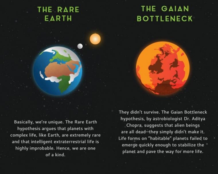 외계인들은 살아남지 못했다. 천체생물학자 Aditya Chopra가 주장한 가이안 병목 가설에 따르면 외계인들은 모두 죽었다 - 그들은 생존하지 못했다. "거주가능한" 행성에 사는 생명체들은 신속하게 행성을 안정화시키고 미래를 준비하는데 실패했다.