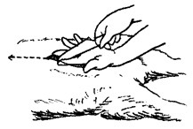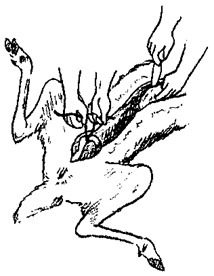 2. 하복부에서 가슴(흉골후단)까지 정중앙 선을 따라 절피 : 헌팅나이프의 껍질벗기기 부분 또는 나이프로 절개. (나이프의 날을 위로 향해, 왼손의 검지와 중지로 칼끝을 커버하면 위장에 상처가 나지 않는다)