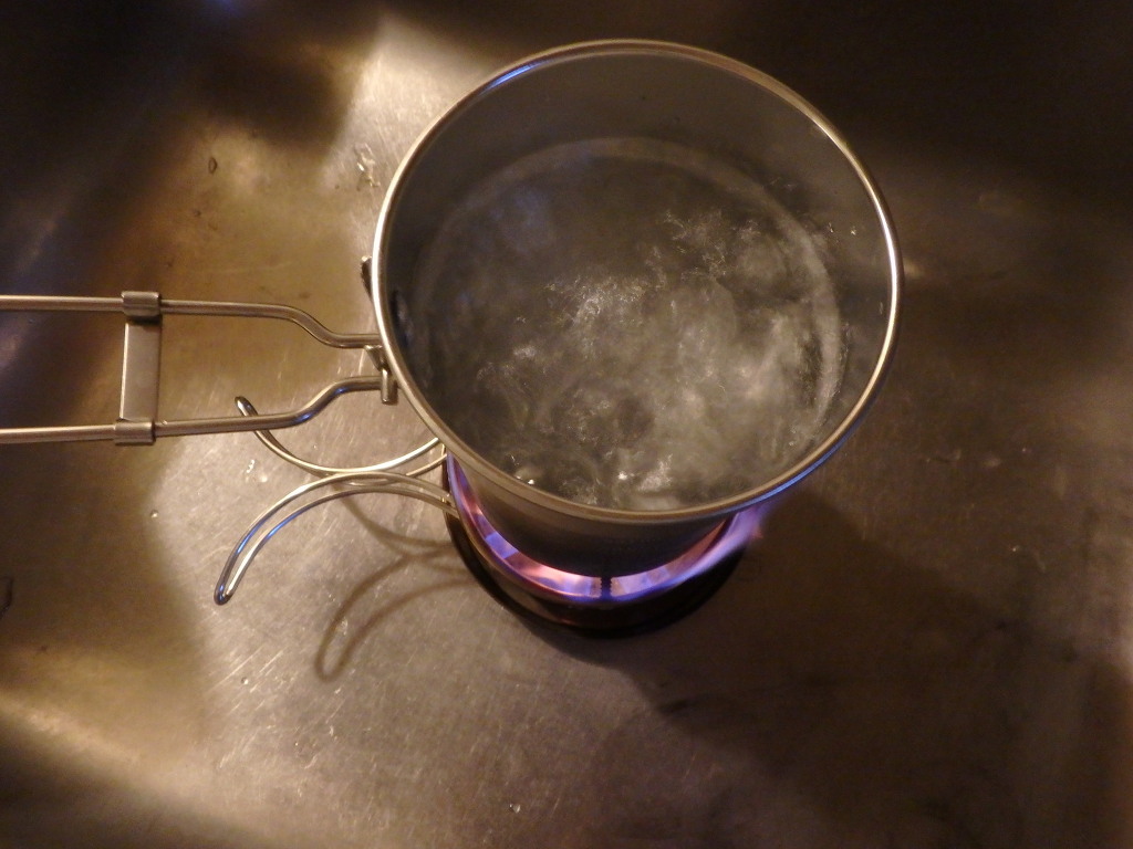 물 완전 펄펄 끓고 있음 ~~~ 약 10 분 걸림. 화력이 어느정도 냐 ?? 보통 LPG 가스렌지에서 사용하는 것과 비슷함.
