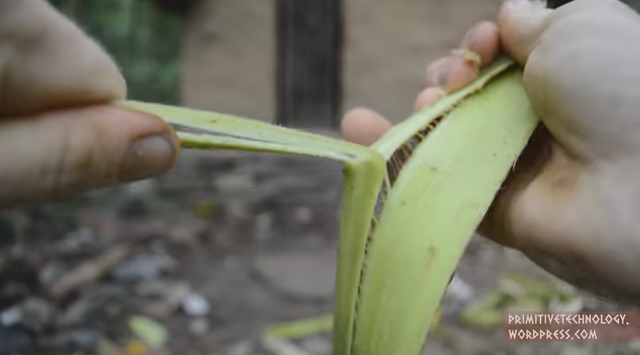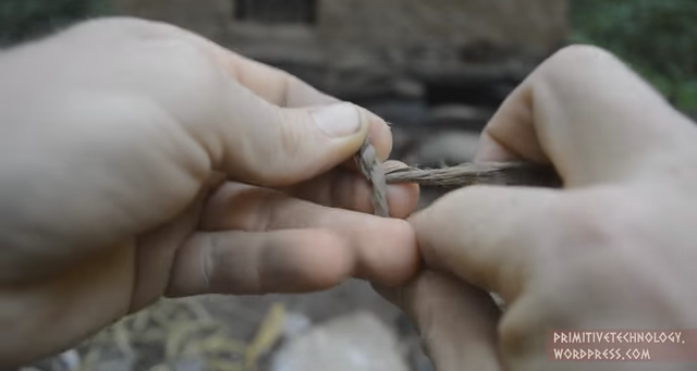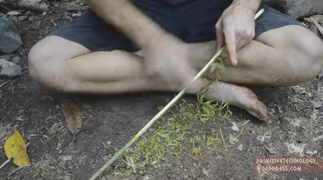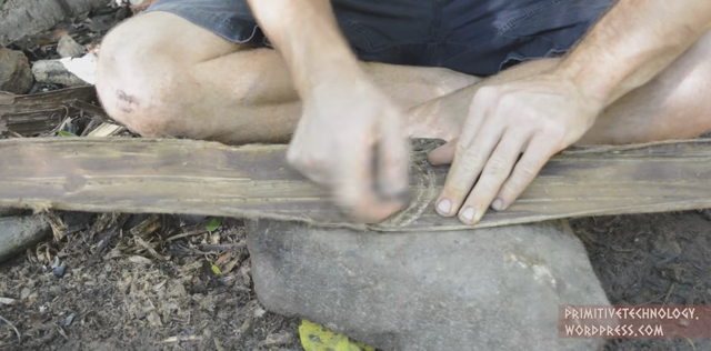 나무 껍질을 벗겨 꼬아 활 줄을 만듭니다.