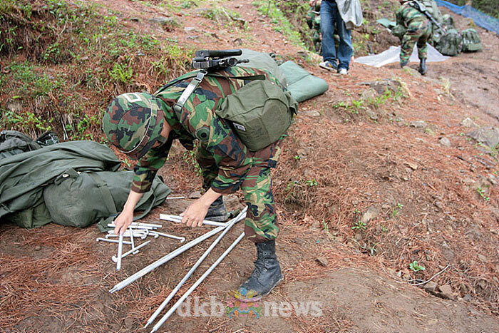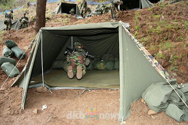 연대본부 인사계(원사)님이 사제 위장무늬 방수포로 작은 지휘소용 텐트를 만들어