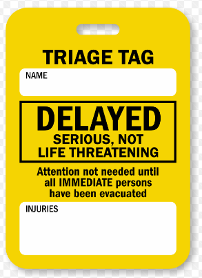 | 노란색 | 지연 / Delayed | 당장 치료할 필요는 없으나, 필요하면 바로 치료할수 있도록 관찰해야 하는 환자. 치료 2순위. |