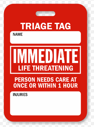 | 빨간색 | 즉각 / Immediate | 당장 응급 치료를 받지 않으면 생명이 위험한 환자. 가장 먼저 치료가 필요하다. 치료 1순위. |