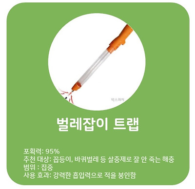 특징 및 장단점: 벌레를 생포하는 트랩으로 곤충 채집 용도로 개발됐지만, 손이 닿지 않는 곳에 있는 벌레나 직접 치우기 껄끄러운 벌레의 사체 등을 처리하는 데 좋다. 특히 바퀴벌레나 꼽등이처럼 에어로졸 살충제 한두 번 분사하는 것만으로는 잘 죽지 않는 보행형 해충들을 처리하는 데 효과적이다.