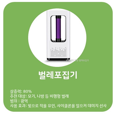 특징 및 장단점: 시중에 다양한 제품이 나와 있으며, 개중엔 모기가 좋아하는 368mm의 자외선 빛과 인체에서 나오는 이산화탄소, 습도를 시뮬레이션해 다각도의 벌레를 유도하여 빨아들이는 제품도 있다.