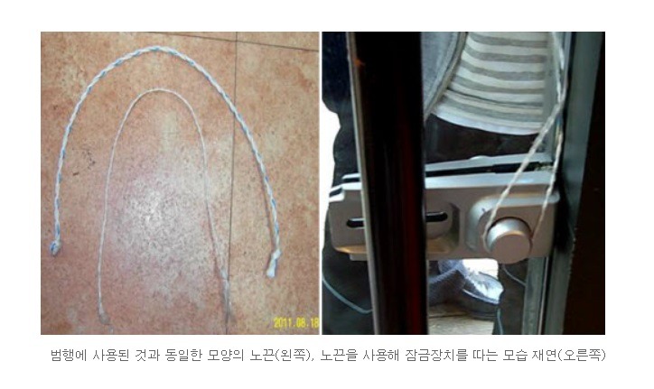 도어락 옆 현관문에 드릴로 작은 구멍을 낸뒤 구부러진 철사를 집어넣어 안쪽의