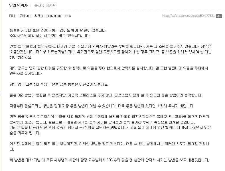 예전 닭관련 카페에 질문했던 내용입니다. 닭 고통없이 빨리 잡는 방법^^;;