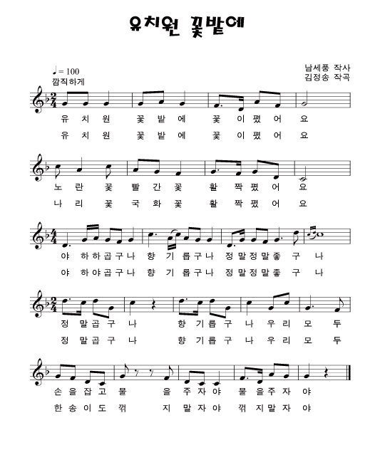 유치원 꽃밭에 - 남세풍 작사 / 김정송 작곡 / 김지윤 노래 / 조순희 지도 작성자밤하늘|작성시간18.04.05|조회수192 목록 댓글 0 글자크기 작게가 글자크기 크게가 유치원 꽃밭에(김지윤).mp3 첨부파일첨부된 파일이 3개 있습니다. jpg 파일 01.jpg 다운로드 jpg 파일 02.jpg 다운로드 mp3 파일 유치원 꽃밭에(김지윤).mp3 다운로드 다음검색 현재 게시글 추가 기능 열기 북마크 공유하기 신고 센터로 신고 댓글 댓글 0 댓글쓰기 답글쓰기 댓글 리스트
