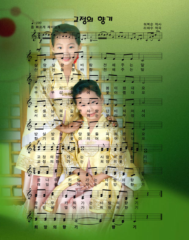 교정의 향기 - 허복순 작사 / 리하수 작곡 / 김주영,김주혜 노래 / 박해연 지도 작성자밤하늘|작성시간13.08.19|조회수257 목록 댓글 1 글자크기 작게가 글자크기 크게가 ♬연변동요♬ 05.교정의 향기(김주영,김주혜).mp3 첨부파일첨부된 파일이 2개 있습니다. jpg 파일 무제-1.jpg 다운로드 mp3 파일 05.교정의 향기(김주영,김주혜).mp3 다운로드 다음검색 현재 게시글 추가 기능 열기 북마크 공유하기 신고 센터로 신고 댓글 댓글 1 댓글쓰기 답글쓰기 댓글 리스트 작성자이병도 | 작성시간 13.08.19 사랑스러운 자매의 노래가 무척 잘 어울립니다.희망을 키워가며 사랑을 실천하는 꿈나무로 멋지게 성장하세요^^ 댓글 전체보기