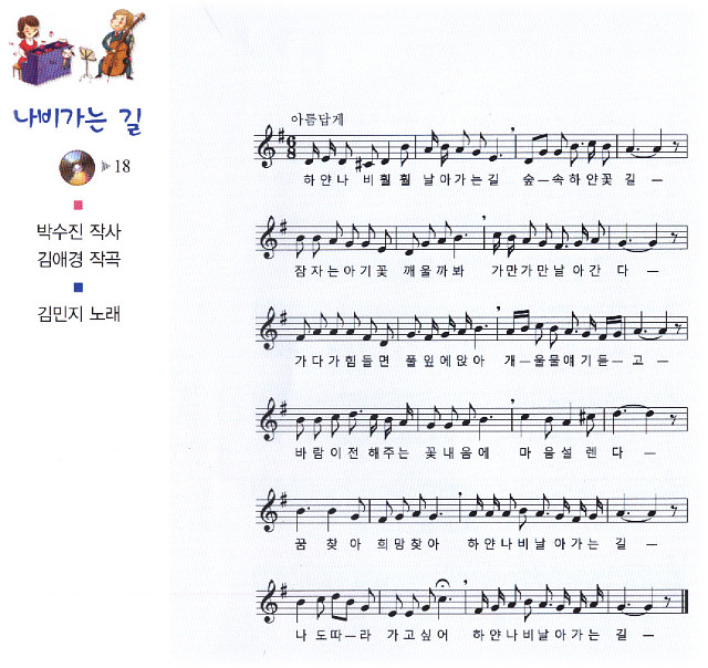 [♬한국동요♬]나비가는 길 - 박수진 작사 / 김애경 작곡 / 김민지 노래 작성자밤하늘|작성시간10.06.08|조회수411 목록 댓글 1 글자크기 작게가 글자크기 크게가 ♬한국동요♬ Track18.mp3 첨부파일첨부된 파일이 2개 있습니다. jpg 파일 18.jpg 다운로드 mp3 파일 Track18.mp3 다운로드 다음검색 현재 게시글 추가 기능 열기 북마크 공유하기 신고 센터로 신고 댓글 댓글 1 댓글쓰기 답글쓰기 댓글 리스트 작성자이병도 | 작성시간 10.06.08 달콤한 꿈을 꾸며 날아가는 느낌이 드는 노래입니다. 어깨가 저절로 움직여지는것 같아요~~~ 댓글 전체보기