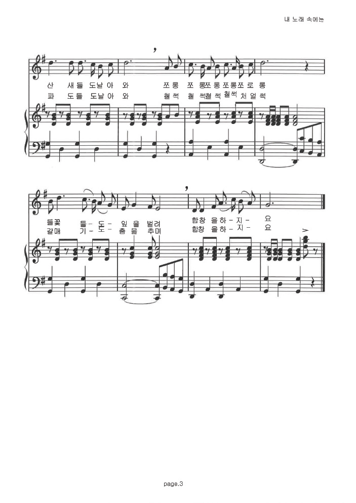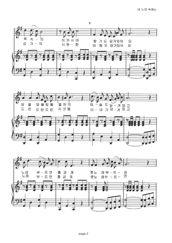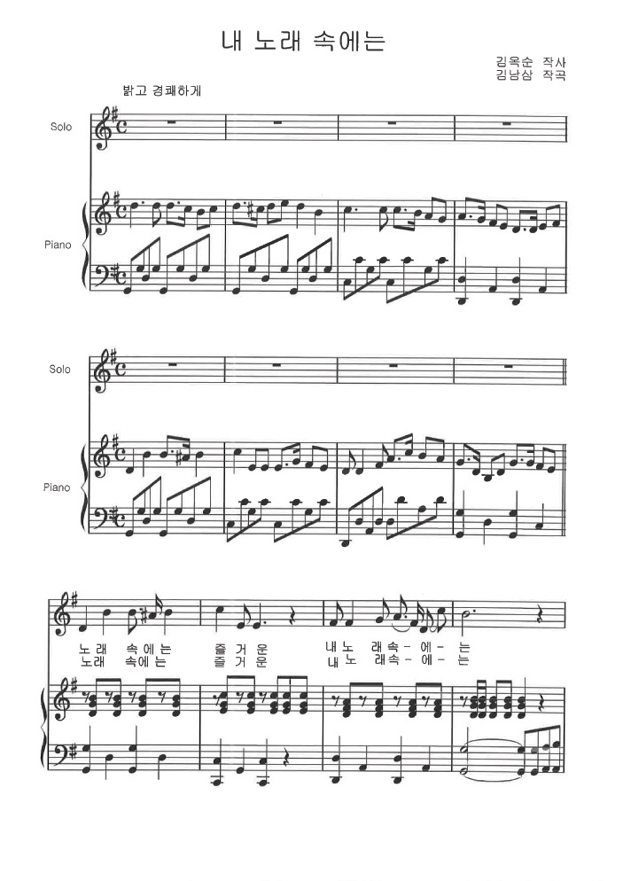 리하경 어린이의 힘찬 노래소리로 '내 노래 속에는'을 감상하니, 곡이 더 살아나는 듯한 느낌을 갖게 됩니다. 리하경의 노래실력은 앞으로 더 향상 될 것으로 생각됩니다. 그리고 그렇게 기대하구요.