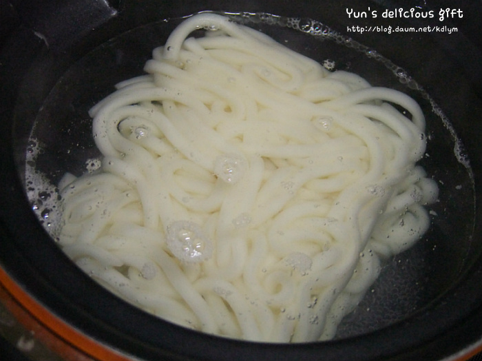 국물이 끓으면 살짝 삶아낸 우동 생면을 넣고 끓여주면 됩니다.