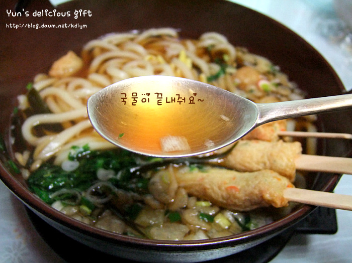국물에 바로 넣는것보다 따로 한번 삶아낸 우동 생면을 국물에 넣어 살짝 끓여 먹으니