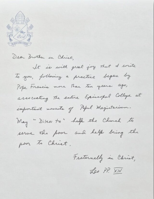 레오 14세 교황은 10월 9일 「딜렉시 테(Dilexi Te)」 발표에 맞춰 전 세계 주교들에게 서한을 보냈다. 교황은 서한에서 “프란치스코 교황께서 10년 전 시작하신 관행을 이어, 교황의 교도권이 중요한 순간을 맞을 때 전 세계 주교단 전체를 함께 참여시키는 전통에 따라, 당신께 이 편지를 큰 기쁨으로 쓴다"며 "「딜렉시 테」가 교회가 가난한 이들을 섬기고, 가난한 이들이 그리스도를 만나도록 돕는 데 이바지하기를 바란다”고 전했다. CNS