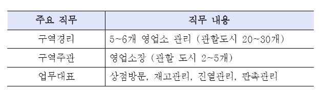 업무대표는 한국의 판매사원과 동일한 업무성격이며, 주로 상점에서의 활동, 경소상과의 업무연락이 주된 업무가 된다. 구역주관은 관리자급으로 주로 영업소장을 맡고 있으며 영업소 관할 도시의 판매를 책임진다. 구역경리는 현지인 체제하에 상당히 큰 조직과 시장을 관리하는 오리온의 핵심적인 중간관리자라 할 수 있다. 비록 간접 판매 형태이지만 영업조직의 시장 관리, 경소상 관리 등의 영업활동이 바로 매출과 연관되기 때문에 영업조직의 영업력은 사업의 성패를 좌우할 결정적 요인이라 할 수 있다.