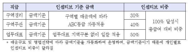 상술한 직급 체계를 바탕으로 영업직 인센티브 제도를 설계, 운영하였고 시장의 변화와 영업 전략에 따라 지속적으로 보안 및 개선을 진행해왔다.