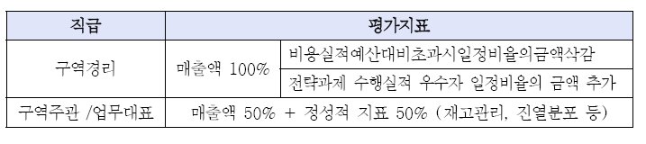 기본적으로 영업인력은 매출액이 가장 큰 평가지표가 된다. 진출 초기 경소상 간접 판매의 형태를 취하면서 경소상에 대한 판매액이 곧 실적이 되고 이를 평가하여 인센티브를 지급하였다. 그 결과 월별로 기복이 심한 실적이 나오기도 하며. 판매, 재고, 물류, 비용 등과 관련된 효율적인 관리 시스템이 미비하여 인센티브 제도의 운영에 있어서 적지 않은 폐단이 있었다. 현재 중국 전역에 영업조직이 구축되고 관련된 시스템이 구축, 가동되면서 인센티브 평가도 단순한 매출액 평가가 아니라 매출액과 비용실적 그리고 정성적 과제 등을 평가지표로 활용하였다. 상위직급 (구역경리)은 매출실적을 100%하여 인센티브 금액을 산정한 후 비용실적, 전략과제 집행도 등을 평가하여 최종적인 인센티브 금액을 결정하는 것이다. 하위직급 (구역주관, 업무대표)은 매출실적 50%, 정성적 지표 (재고, 진열, 비용실적)50%로 비중을 평가하고 있다.