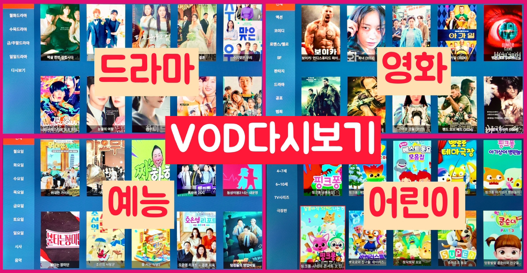 Live100채널/드라마,예능,영화, 어린이 등 수천편의 VOD다시보기를 고화질로 언제든 시청가능!