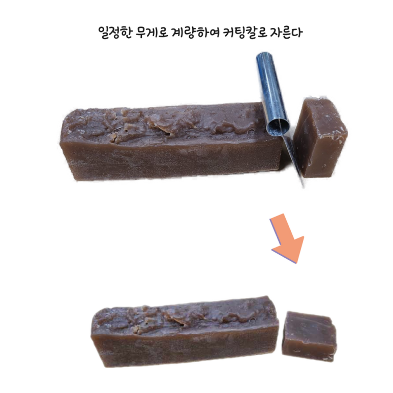수제비누는 명시 되어있지 않으나 화장품책임판매관리자에게서 구입한 1kg용 비누바를 100g으로 커팅 시
