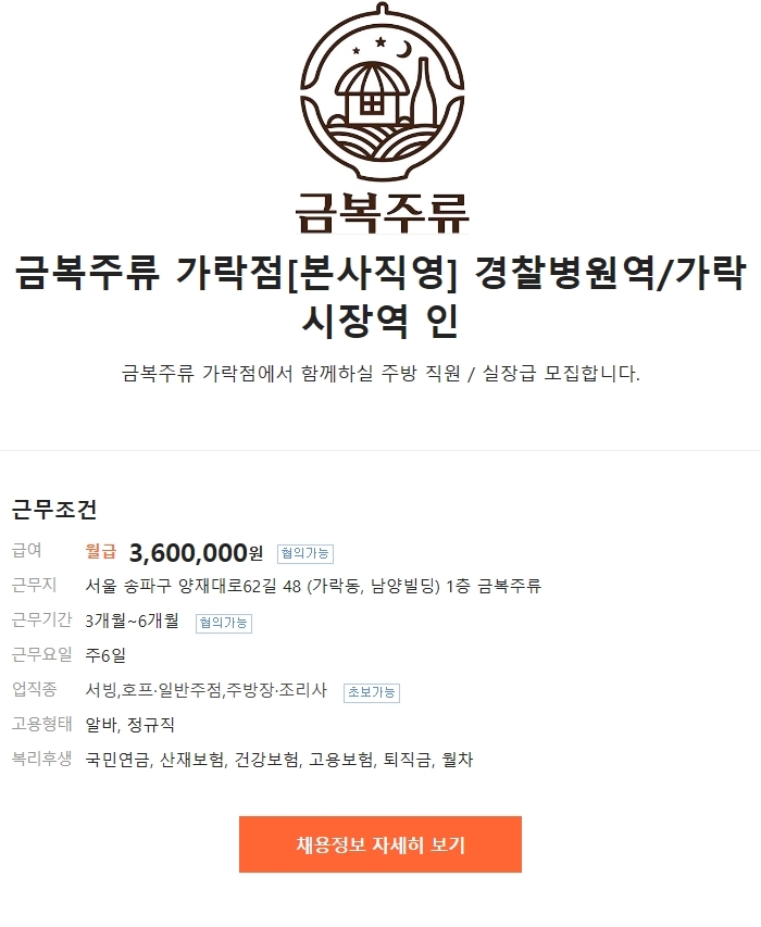 【금복주류 가락점[본사직영]】경찰병원역/가락시장역 금복주류 가락점에서 함께하실 주방 직원 / 실장급 모집합니다. 작성자황금잉어|작성시간23.01.05|조회수319 목록 댓글 0 글자크기 작게가 글자크기 크게가 【금복주류 가락점[본사직영]】경찰병원역/가락시장역 금복주류 가락점에서 함께하실 주방 직원 / 실장급 모집합니다.http://joburl.kr/uk6fz금복주류 가락점[본사직영] 경찰병원역/가락시장역 인 : 금복주류 가락점에서 함께하실 주방 직근무지역 : 서울 송파구 양재대로62길 48 (가락동, 남양빌딩) 1층 금복주류, 급여 : 월급 3,600,000, 마감일 : 상시모집www.albamon.com 다음검색 현재 게시글 추가 기능 열기 북마크 공유하기 신고 센터로 신고 댓글 댓글 0 댓글쓰기 답글쓰기 댓글 리스트