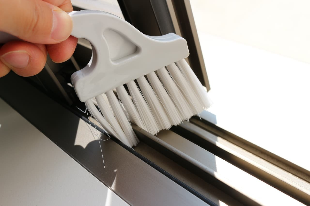 창틀 구석 방향으로 움직이지 말고, 먼지가 빠지는 방향(배수구 쪽)으로 쓸어낸다.