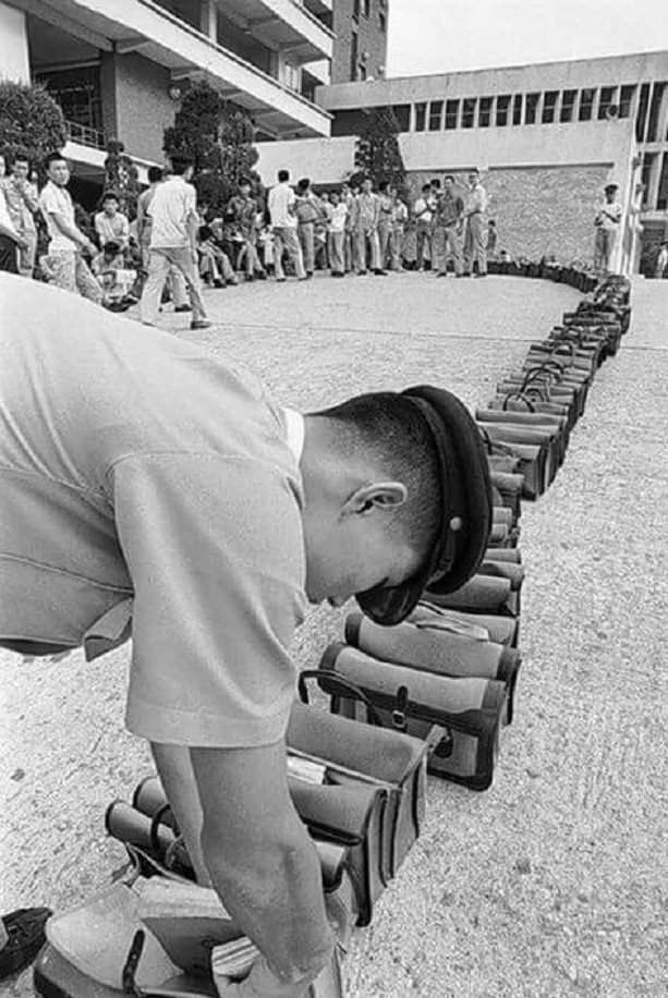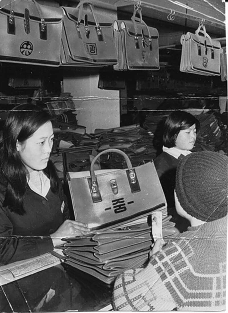 국민학교를 졸업하고 가방매장에서 중학교 가방을 고르는 소년 - 1971년 서울