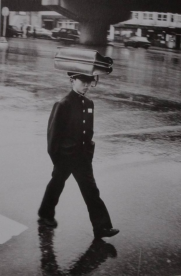 비 오는날 책가방을 머리위에 얹고 서율역 근방을 걸어가는 중학교 1년생- 1975년 4월