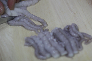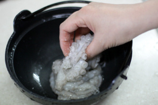 낙지는 머리와 몸통을 분리합니다. 몸통과 다리부분은 굵은 소금에 박박 주물러 깨끗이 씻으면