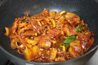고추를 넣어 센불에 볶음을 합니다. 삼겹살과 낙지가 다 익으면 불에서 내리고 그릇에 담아냅니다.