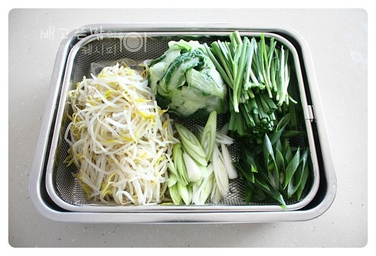 5~6cm길이로 자른 부추 한줌, 어슷하게 썬 대파 1대를 준비했습니다.