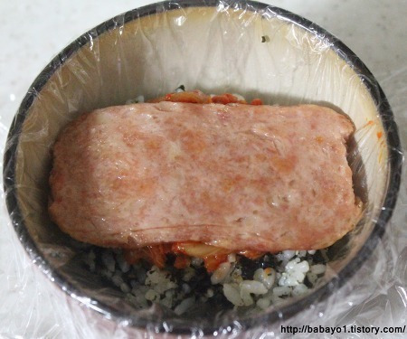 스팸을 김치위에 올려줍니다.