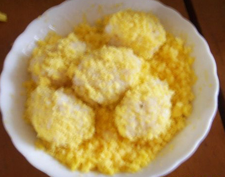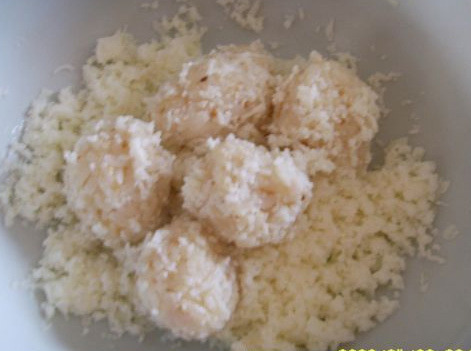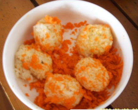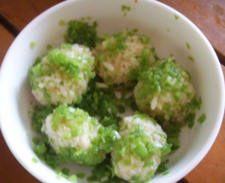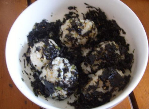 ▶ 먹기 좋은 크기(한 입)로 만든 주먹밥에 옷을 입혀 줍니다.